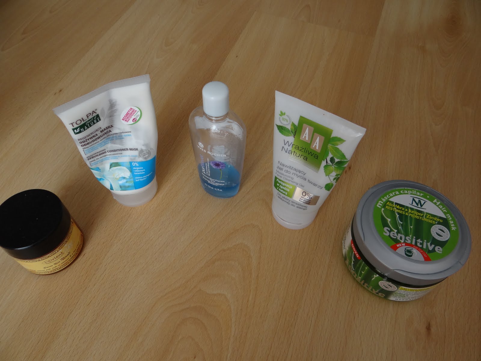 1) Alterra, olejek migdały&papaja- kupiony z myślą o olejowaniu włosów, częściowo zużyty do oczyszczania twarzy (ma w składzie olejek rycynowy, więc jest gotową mieszanką ocm) Kupię ponownie.2) Alterra, szampon z kofeiną i biotyną- jak dla mnie szampon jest produktem, który jest na skórze głowy zbyt krótko, żeby jego składniki mogły pobudzić porost, także nie będą go oceniać pod tym względem.